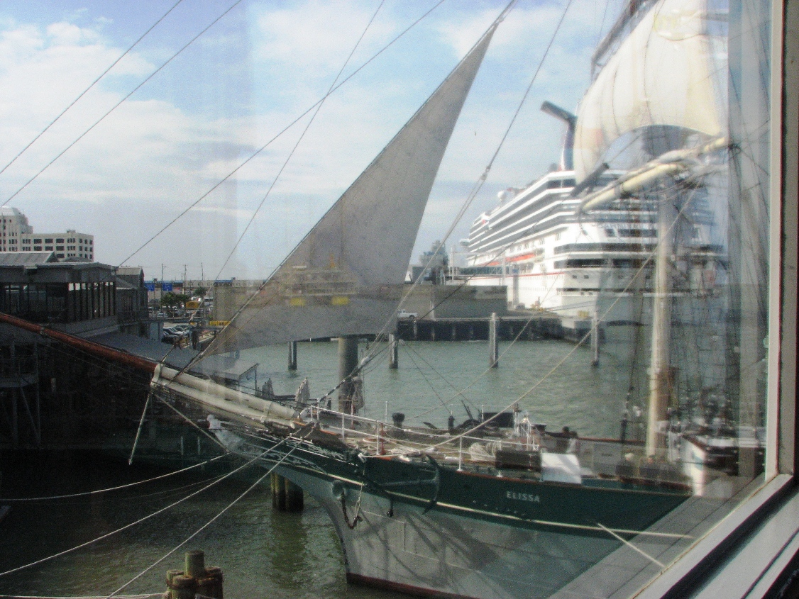 I once toured the Elissa, a tall sailing ship docked at Galveston. Never mind she was built in 1877 and should have retired fifty years ago, she’s a beautiful sailing ship, with a mammoth iron anchor, masts and canvas and hammocks and everything kept sea-worthy. Occasionally, I dream of taking passage on a ship just like her.