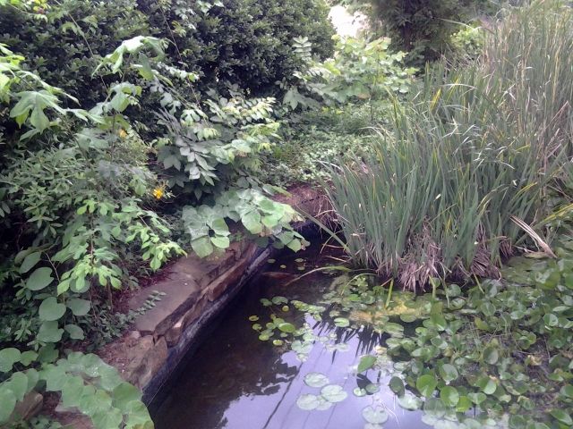 A shallow pond has to have a pump in it to stay pretty. This one pumps a small stream of water to the top of a little rock waterfall. It fills a bathtub-size pool of water, splashes down into a larger one and then finally back into the pond. The effect is amazingly natural, soothing and impressive.